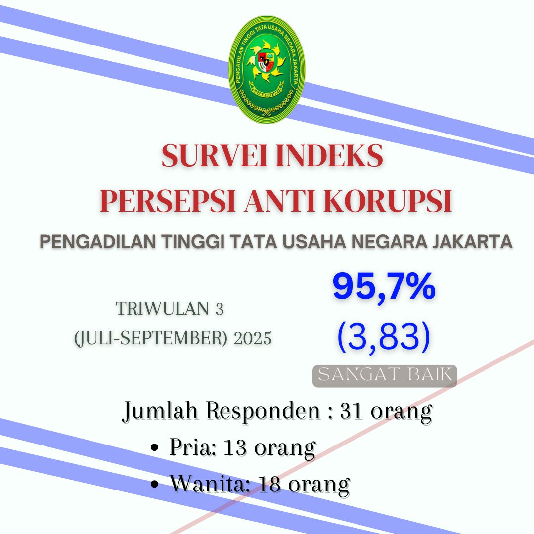 Bersamaan dengan pelaksanaan Survei Indeks Kepuasan Masyarakat, Pengadilan Tinggi Tata Usaha Negara Jakarta juga melaksanakan Survei Indeks Persepsi Anti Korupsi periode Juli s.d. September 2025. Hasil Survei Indeks Persepsi Anti Korupsi menunjukkan bahwa dari 31 orang responden yang mengisi kuisioner, diperolehlah angka indeks sebesar 3,83 atau 95,7%. Hal ini memperlihatkan bahwa indeks Survei Indeks Persepsi Anti Korupsi Pengadilan Tinggi Tata Usaha Negara Jakarta sangat baik.