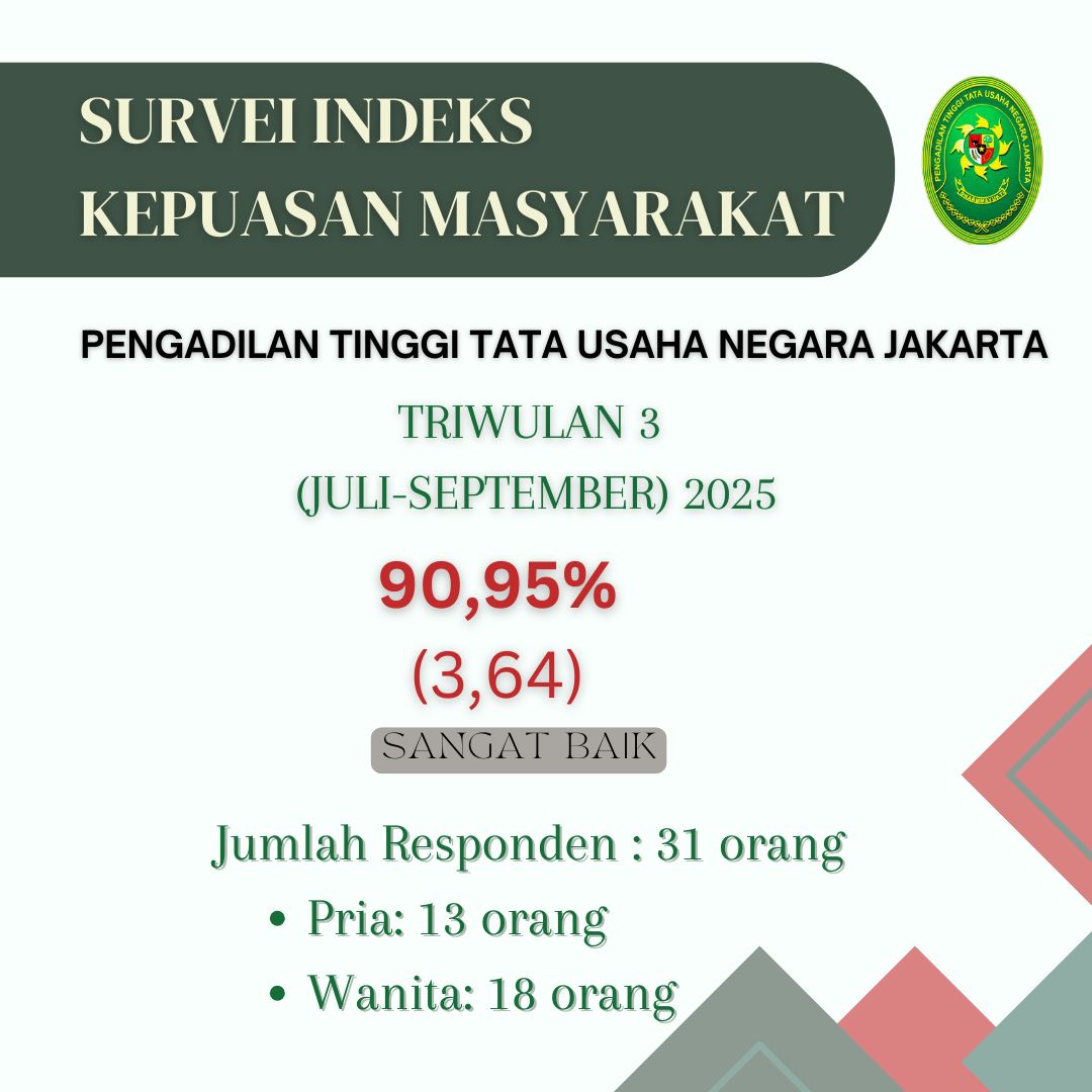 Hasil Survei Indeks Kepuasan Masyarakat Pengadilan Tinggi Tata Usaha Negara menunjukkan angka 3,64 dengan kepuasan sebesar 90,95%, masyarakat menilai sangat puas. Survei ini diambil dari 31 orang responden yang berkunjung ke Pengadilan Tinggi Tata Usaha Negara Jakarta selama periode Juli s.d. September 2025.